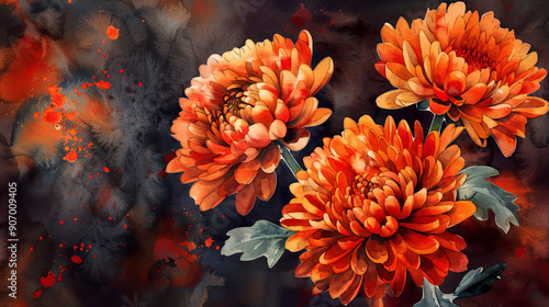Watercolor Orange chrysanthemums in negative painting style, striking and vibrant against a dark background