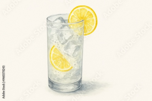 Watercolor painting of a tall glass filled with refreshing lemonade, ice cubes, and lemon slices, creating a cool and thirst-quenching beverage