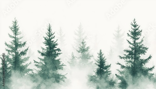 Watercolor Painting of Pine Trees Shrouded in Fog. Serene and Atmospheric Natural Scene Background