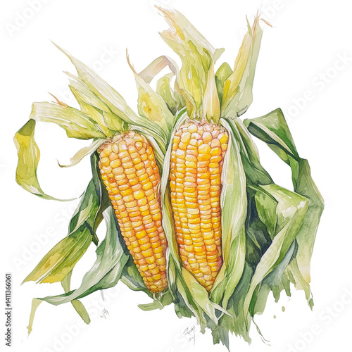 Watercolor Painting of Two Fresh Corn Cobs with Green Leaves Isolated on White