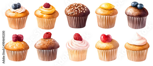 Watercolor Set of Delicious Cupcakes with Different Toppings