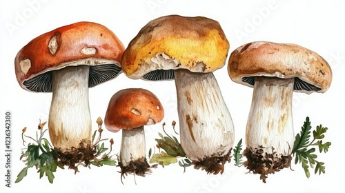 Watercolor set of edible mushrooms isolated on white background. Boletus edulis, penny bun, porcini, boletus edulis, king bolete, porcini