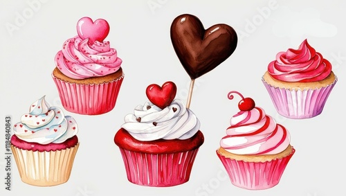 Watercolor Valentine s Day Cupcakes Collection Pink Red Chocolate Heart Treats