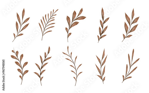 Watercolor vector branches with leaves, isolated fall season decor elements on white background.