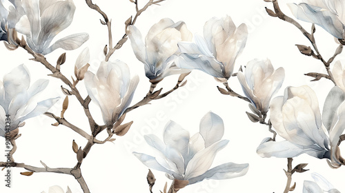 Watercolor vintage magnolia patterns in dry brush style, expressive and bold lines, clean white background