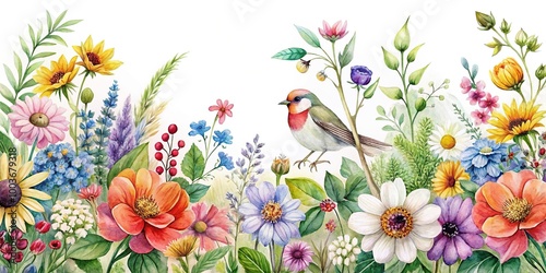 Watercolor wildflower clipart featuring colorful blooms and greenery on white background