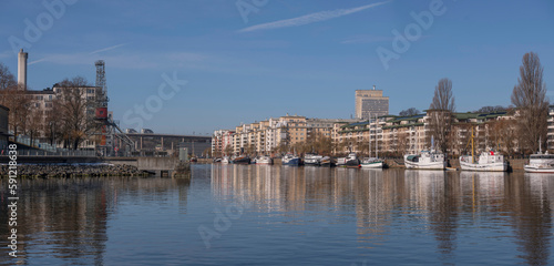 Waterfront apartment house and boats at a pier in the bay Hammarby sjö, a sunny spring day in Stockholm