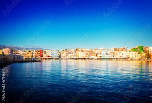 waterfront of Chania bay at sunny day, Crete island, Greece, retro toned