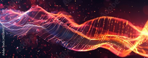 Wave of orange particles. Abstract technology flow background. Sound mesh pattern or grid landscape.