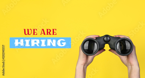 We are hiring. Woman holding binoculars on yellow background, closeup. Banner design. Human resource, recruitment concept