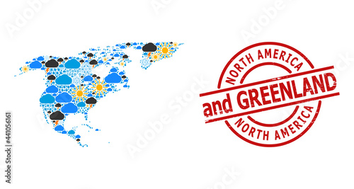 Weather mosaic map of North America and Greenland, and textured red round seal. Geographic vector composition map of North America and Greenland is created with scattered rain, cloud, sun,