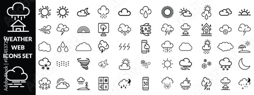 Weather set of web icons in line style. Forecast weather icons for web and mobile app. Forecast, clouds, sunny day, wind, snowflakes, sun, rain, thunder storm, dew, wind, moon. Vector illustration