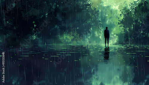 Weathered illustration of melancholy with rain falling on a desolate landscape. Indigo and Green tones. Grunge-style illustration design