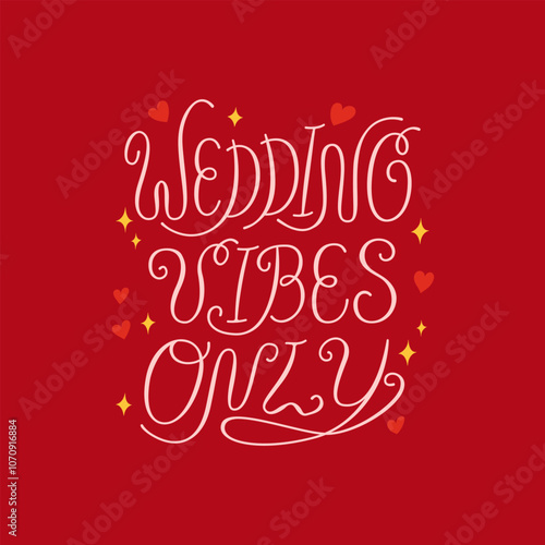 Wedding vibes only handwritten vector quote with hearts, stars and doodle elements. Elegant calligraphy lettering for holiday greeting cards and invitations