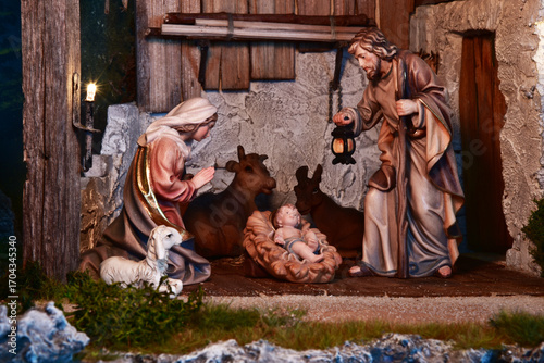 Weihnachtskrippe im alpenländischen, ländlichen Stil, mit Bergen und Nachthimmel als Hintergrund, in gemütlichem Stall aus alten Holzbalken und stimmungsvoller Beleuchtung