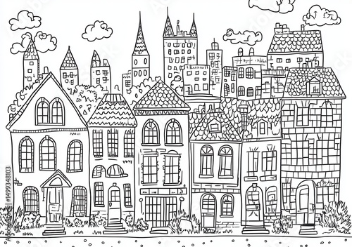 Wektorowa ilustracja ręcznie rysowanych budynków miejskich w stylu vintage, linia sztuki do kolorowania dla dorosłych.