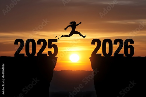 Welcome merry Christmas and happy new year in 2026, wallpaper, Silhouette Man jumping from 2025 cliff to 2026 cliff with cloud sky and sunlight. silhouette of a man jumping