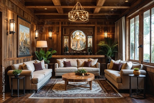 Welcoming Wooden Reception Space with Comfortable Sofas and Warm Atmosphere