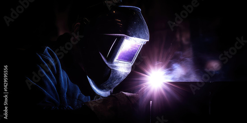 Welder in protective gear works intensely, dark environment illuminated by bright welding sparks and light, helmet covering face, focused on metalwork, creating a vivid light burst