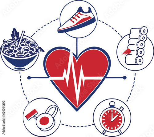 Well-being Journey: An illustrative graphic that depicts the key ingredients for a healthy life. Showcasing the harmony of a healthy heart, nutritious food, fitness and sleep with focus on wellbeing.