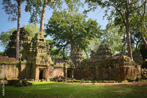 Western gate of the inner courtyard of Ta Prohm temple ruins, located in Angkor Wat complex near Siem Reap, Cambodia.