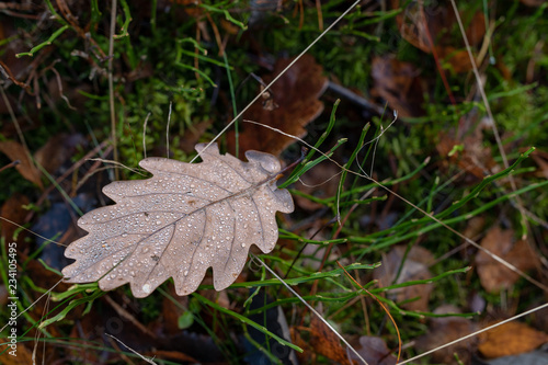 Wet leaves of an oak tree lying on a forest path. Leaves of deciduous trees after the first frosts.
