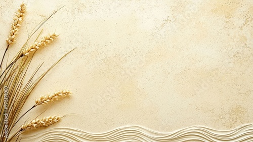 Wheat Ears on Beige Textured Background with Wavy Lines