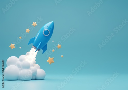 Whimsical blue rocket launch with stars and clouds on minimalistic background for creative design