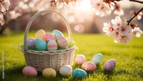 Whimsical Easter Basket with Ornate Eggs Under Blossoming Cherry Tree | 8K Hyperrealistic Photo with Soft Focus, Bokeh & Cinematic Lighting