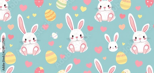 Whimsical Easter bunny seamless pattern with eggs & hearts Bright, cheerful design ideal for spring projects, scrapbooking, fun
