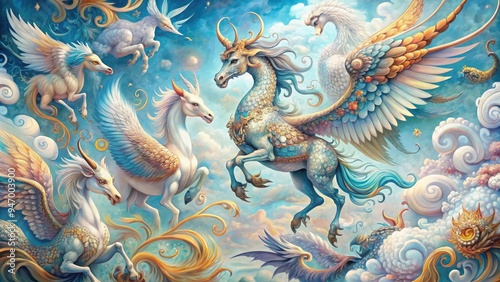 Whimsical illustrations of fantastical creatures, including dragons, unicorns, and phoenixes, surrounded by intricate swirls and patterns, against a soft, dreamy, pale blue background.