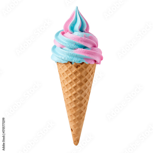 Whimsical pastel ice cream swirl in crispy cone, isolated against plain canvas, a summer treat