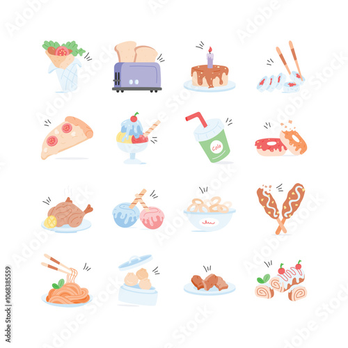 Whimsical vector icons of various food and beverages, showcasing a playful and inviting style