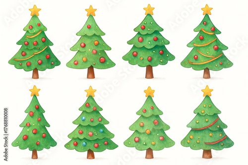 Whimsical watercolor christmas trees with simple ornaments and stars illustration for festive holiday decor and seasonal art concepts, SET