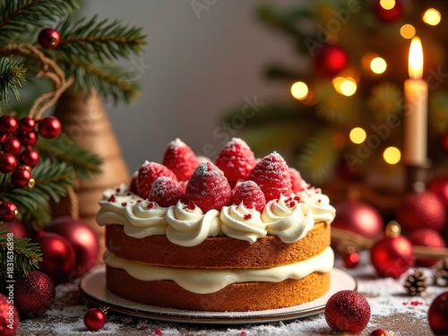 Whipped cream cake by Christmas tree, fine art close‑up photo