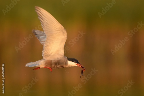 Whiskered Tern (Chlidonias hybrida) captured in flight with hunted frog
