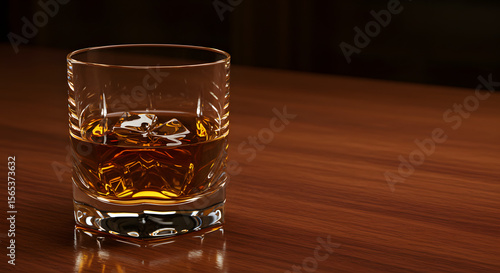 Whiskey glass on mahogany bar counter