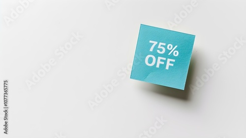 White '75% OFF' Text on a Cyan Square Paper Note. White Background with Copy Space