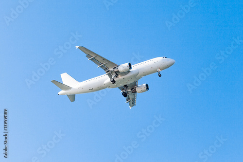 white airplane on a blue background. airplane in the sky