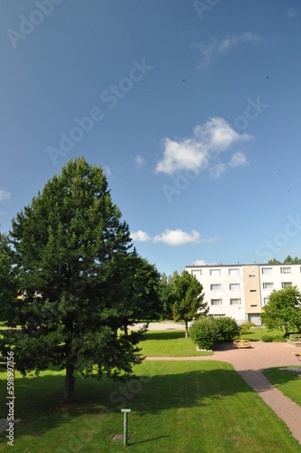 White and beige apartment building with a lovely green yard. Big conifer, juniper, pine tree. Sand path and playground for childern. Warm summer day and blue sky with small clouds.