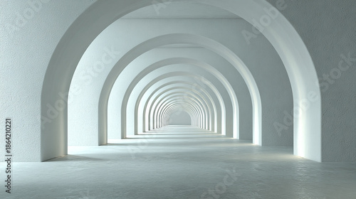 White architectural archway corridor inside a building, featuring repeating arches and depth, rendered in 3D with clean lines and modern minimalist design.