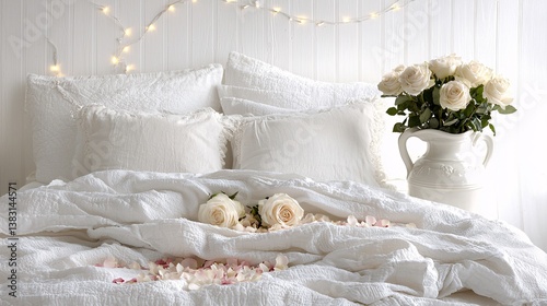 white bedroom with a romantic touch, where the bed is decorated with fresh rose petals and elegant roses in a vase, creating a peaceful and intimate ambiance. romantic bedroom, white decor,