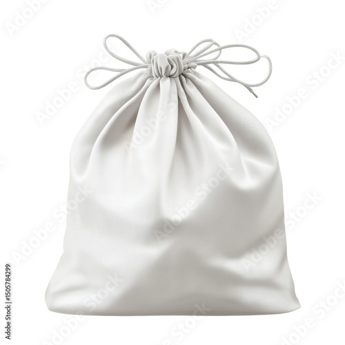 White blank fabric bag with drawstring curtain, isolated on transparent background, PNG file,