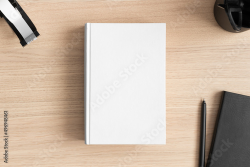 White book mockup with workspace accessories on the wooden table.