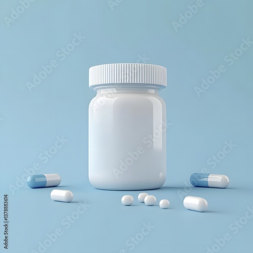White Bottle with Capsules and Pills on Blue Background