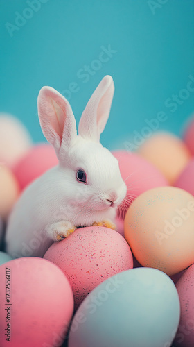 White bunny with colorful Easter eggs