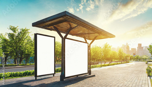 White bus stop billboard poster in a station with cars in moving in the background, Front view, mockup concept blank poster, city traffic