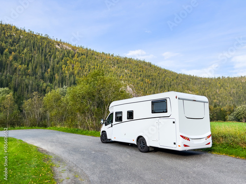 White camper van parked near a beautiful forest and mountains, enjoying the scenic landscape during a road trip