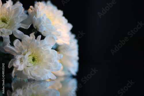 White chrysanthemum flowers on the table with beautiful background and illumination