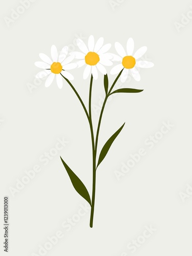 White daisies with a green stem and leaves, decorated with three delicate inflorescences with a bright yellow center.
